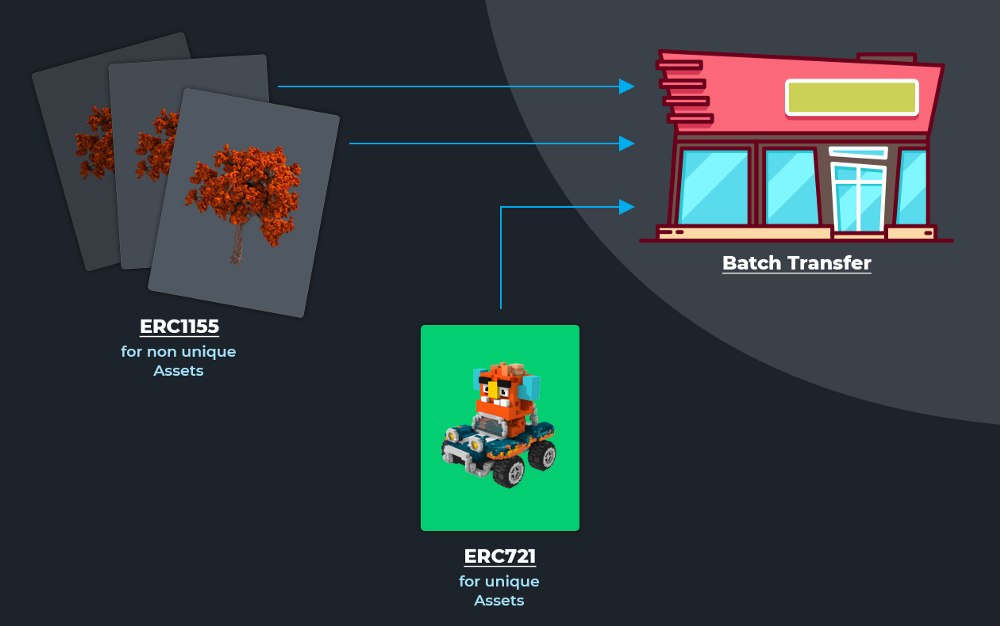 더샌드박스와 기존 UGC 게임의 차별점은 이더리움의 ERC-721 대체불가능토큰(NFT, non-fungible token)에 있습니다. 더샌드박스는 2019년 8월 복셀 모델을 ERC-721 또는 ERC-1155 토큰으로 발행해 거래하는 마켓플레이스를 선보이고 이어 복스에디트로 제작하거나 마켓플레이스에서 구매한 디지털 자산을 활용해 게임을 만드는 게임 에디터를 출시했습니다. 복셀 모델 토큰화에는 대체불가능토큰인 ERC-721뿐 아니라 대체가능토큰 ERC-1155도 함께 활용되었는데 ERC-1155를 활용하면 단일 트랜젝션으로 같은 종류의 아이템을 여러 개 만들 수 있기 때문입니다. ERC-721만 사용하면 "한 종류의 디지털 자산을 단 한 번뿐이 발행하지 못하고, (크립토키티의) 고양이 1000마리를 만들려면 가스비도 1000번 내야" 합니다. ERC-1155를 활용하면 똑같은 무기를 여러 개 쌓아두고 게임을 즐기는 데 익숙한 이용자의 경험을 블록체인 게임에도 그대로 가져올 수 있습니다. 복셀 아티스트의 수익 또한 ERC-721만 이용했을 때에 비해 커집니다.