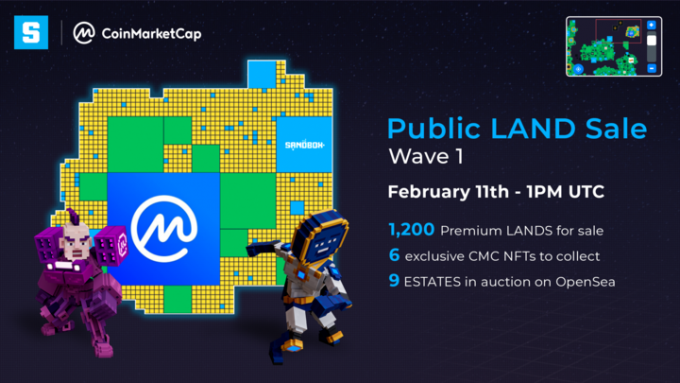 블록체인 기반 사용자 제작 콘텐츠(UGC) 게임 ‘더 샌드박스(The Sandbox)’는 게임 내 가상공간 랜드(LAND)의 첫 번째 퍼블릭 세일을 2021년 2월 11일 진행했습니다. 암호화폐 시세 및 정보 제공 사이트 코인마캣캡(Coinmarketcap)과 함께 진행하여 코인마캣캡은 더 샌드박스의 초대형 랜드를 구매하고 코인마캣캡의 로고를 랜드에 새겼습니다. 또 더 샌드박스는 1,200개의 랜드와 함께 코인마켓캡을 대표하는 5종류의 NFT(대체 불가능 토큰) 캐릭터를 판매했습니다.