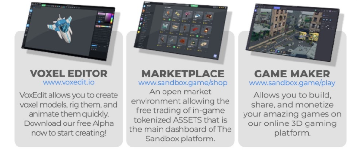 더샌드박스는 제작자가 블록체인에서 복셀 자산 및 게임 경험을 통해 수익을 창출 할 수 있는 커뮤니티 중심 플랫폼으로, 현재 전 세계에서 가장 유망한 10가지 블록체인 게임 중 하나로 선정되었습니다. 또한 더샌드박스는 대체불가토큰를 활용한 차세대 게임 플랫폼으로서 사용자들은 자신만의 복셀 게임을 만들어 수익을 창출할 수 있습니다. 더샌드박스는 크게 세 가지로 복셀 아이템과 캐릭터를 사용자가 직접 제작할 수 있는 "복스에딧"(VoxEdit), 아이템을 직접 거래할 수 있는 "마켓플레이스", 그리고 아이템들을 활용해 게임을 제작할 수 있는 "게임 메이커"로 구성됩니다.
